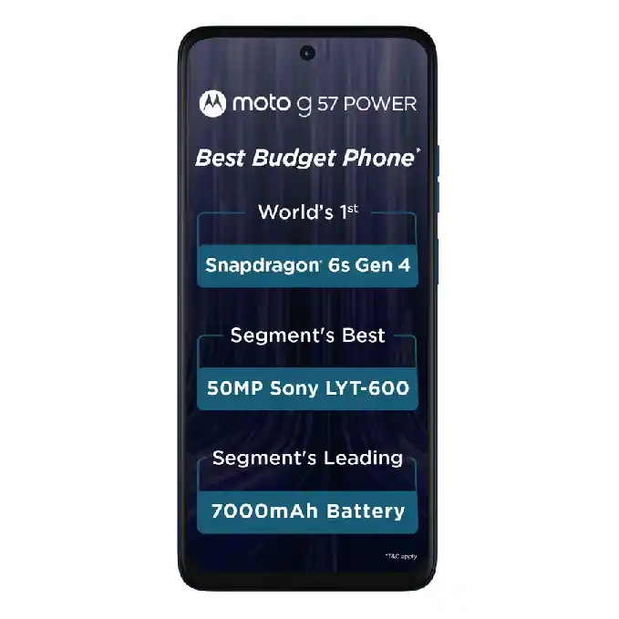 The Motorola g57 POWER 5G is designed for users who demand long-lasting power, smooth performance, and reliable durability in everyday use. Featuring a segment-leading 7000mAh battery, a 120Hz Full HD+ display, and the Snapdragon 6s Gen 4 processor, it is built to handle long workdays, entertainment, travel, and gaming without interruptions. With a Sony LYTIA camera, premium vegan leather finish, and Android 16, the moto g57 POWER 5G delivers dependable performance with a premium touch.