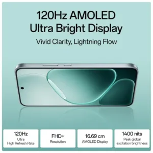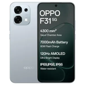 Power through your day with the OPPO F31 5G, featuring a massive 7000mAh battery and 80W SuperVOOC Flash Charge. Capture stunning shots with the 50MP AI dual camera and enjoy ultra-smooth visuals on the 6.57-inch FHD+ display. Built tough with 360° Armour Body and IP69 water resistance, it’s designed for adventure and productivity. Experience lightning-fast performance with the Dimensity 6300 processor and expandable storage.