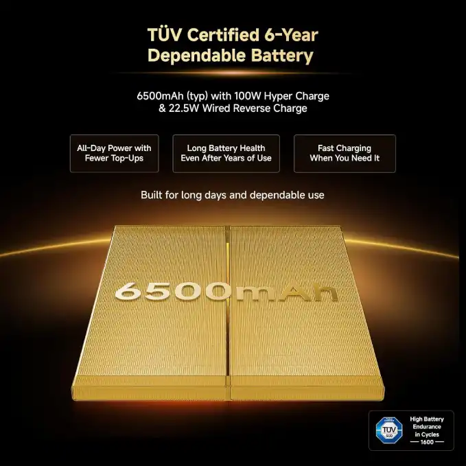 The phone supports 100W HyperCharge, allowing you to charge the massive 6500mAh battery extremely quickly, along with 22.5W reverse charging support.