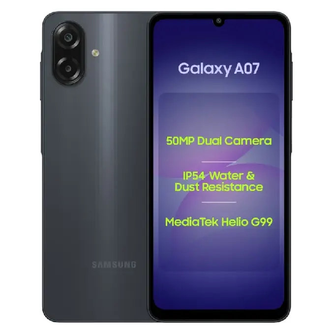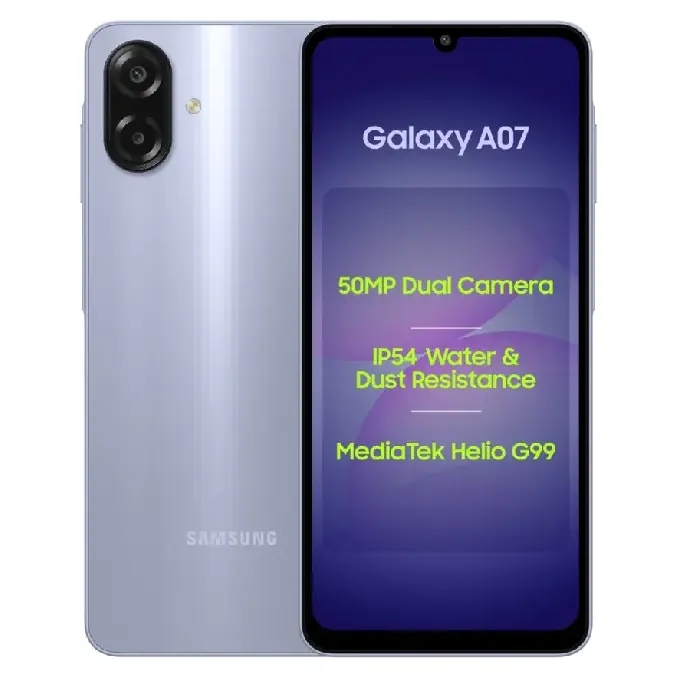 The Samsung Galaxy A07 LTE is built for users who want reliable everyday performance, a large smooth display, and long-term software support at an affordable price. Powered by the efficient MediaTek Helio G99 processor and running on Android 16 with One UI 7.0, this smartphone delivers smooth multitasking, stable performance, and future-ready updates with up to 6 generations of OS upgrades.