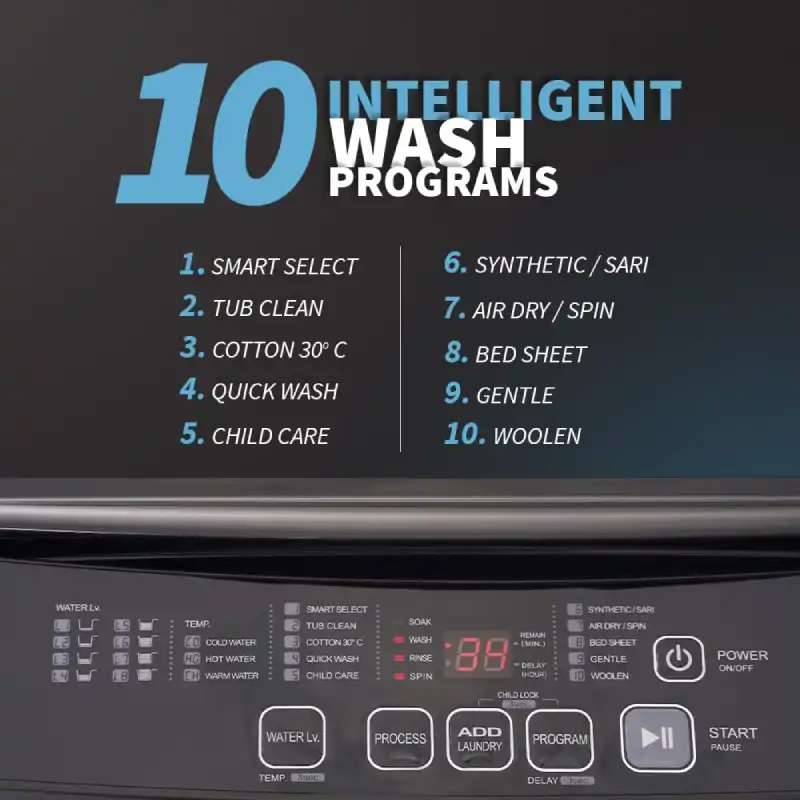 Choose from 10 wash programs including Smart Select, Tub Clean, Cotton 30°C, Quick Wash, Child Care, Synthetic/Saree, Air Dry/Spin, Bed Sheet, Gentle, and Woollen. These options ensure effective cleaning for every fabric type while maintaining fabric quality.
