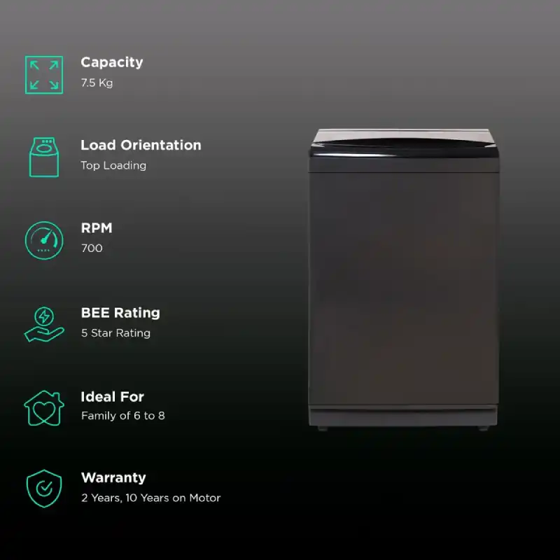 The 7.5 Kg capacity makes this washing machine suitable for medium-sized households. It can easily handle daily laundry loads including clothes, bedsheets, and delicate fabrics, ensuring maximum convenience.