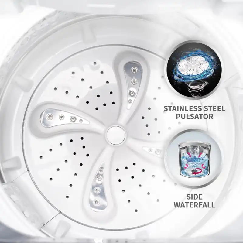 The Stainless Steel Insert Pulsator creates strong water currents that penetrate deep into fabrics, removing dirt effectively without damaging clothes. Combined with the Dual Waterfall Wash, it ensures detergent is evenly distributed for hygienic, lint-free laundry.